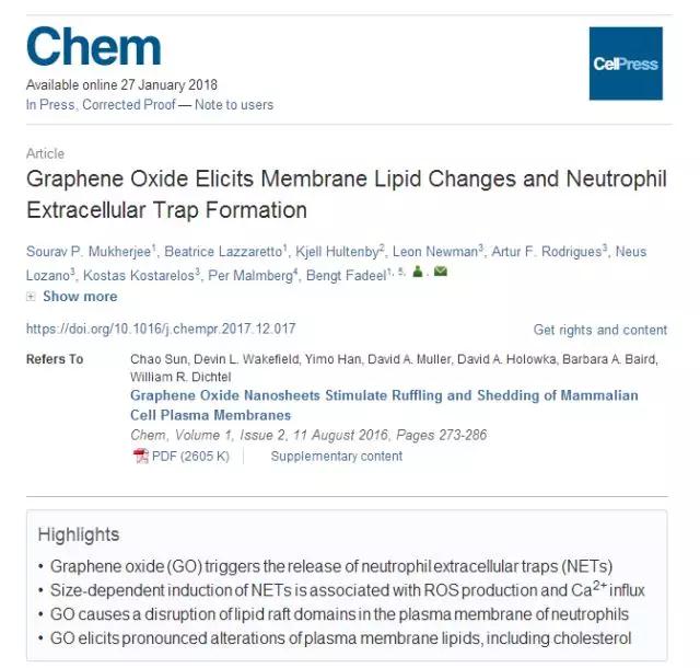 1月27日,《化學》(Chem)在線發(fā)表了曼徹斯特大學和Chalmers技術(shù)大學Karolinska研究所的研究人員,關(guān)于氧化石墨烯誘發(fā)膜脂變化和中性粒細胞胞外陷阱形成的最新研究成果。該論文題為“GrapheneOxideElicitsMembraneL...